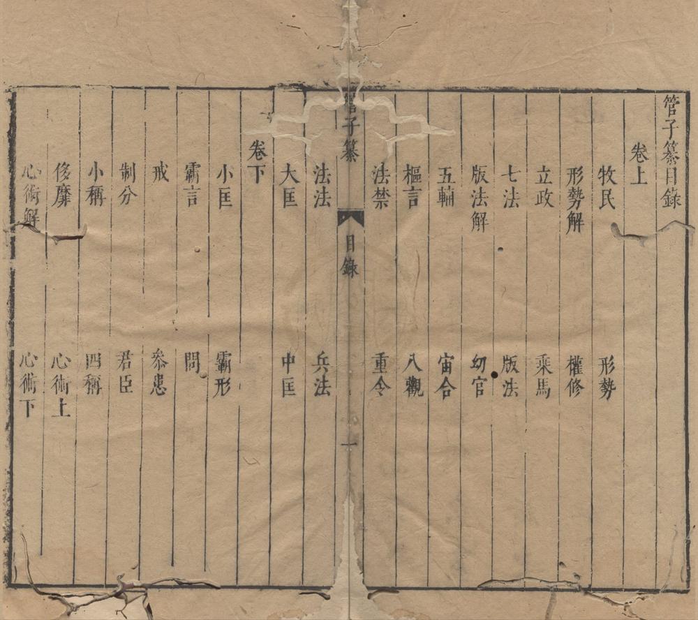 | 书签目录 | 管韩合纂序 管子纂目錄 管子纂卷上 牧民 形勢 形勢解 權修 立政 乗馬 七法 版法 版法解 宙合 五輔 㓜官 樞言 八觀 法禁 重令 法法 兵法 大匡 中匡 管子纂卷下 小匡 霸形 問 霸言 戒 㕘患 君臣 制分 小稱 四稱 侈靡 心術上 內業 白心 心術下 心術解 水地 勢 四時 任法 九變 明法解 冶國 小問 七主七臣 海王 地員 九守 國蓄 輕重乙 輕重戊 輕重丁 讀管韓 |